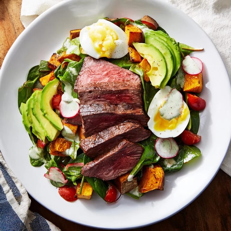 This bowl is more forgiving than it seems. Swap the beef for grilled chicken breast if you want something milder or if that's what you have on hand—it'll need about the same sear time. Tofu works too if you're vegetarian; just press it well and treat it the same way you would the beef. You can add grains if you want more carbs (I use brown rice or cooked quinoa), throw in roasted broccoli or snap peas, or trade the greens for cooked kale if you like something more substantial. The dressing is flexible too—use tahini instead of yogurt if you prefer, or a simple vinaigrette. The only non-negotiable in my mind is the jammy egg; that's what ties everything together and keeps the bowl from feeling like you're just eating a pile of health food.