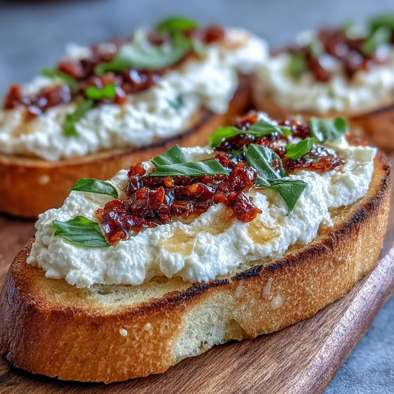 What makes these bruschetta special is the careful balance of textures happening in each bite. The crispy toast provides a sturdy base, the ricotta adds that creamy middle, and then the chili crunch gives you a little surprise of crispness and heat that keeps things interesting. I've learned that when you get the texture right, people automatically think you're a better cook than you actually are.